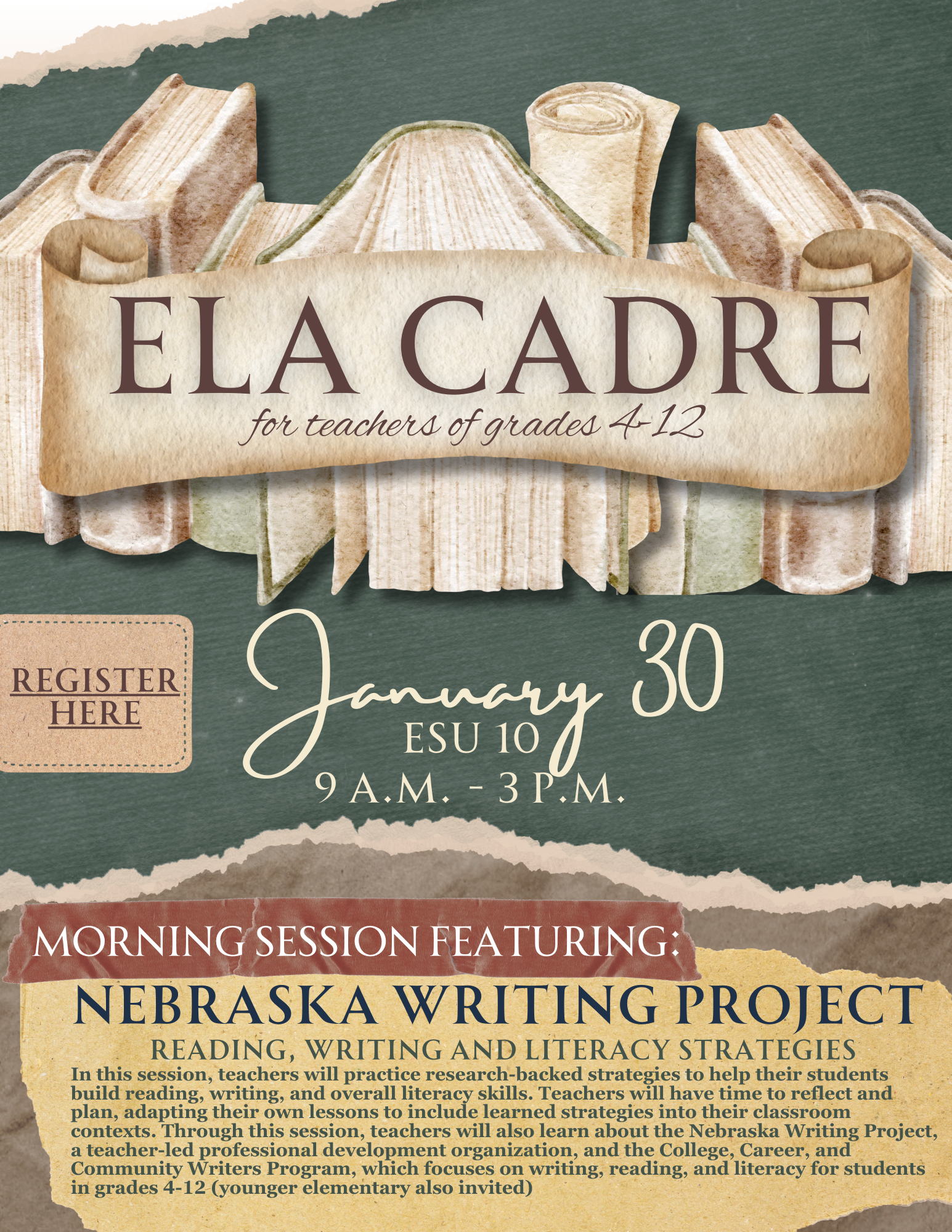 | Description | | Welcome, teachers of reading, writing, and speaking/listening! This day of networking will bring together late elementary, middle, and high school English/Language Arts teachers across the ESU 10 area to provide professional development as well as a time to share resources and ideas from your classrooms. Topics for discussion and learning will center around the ELA standards and shifts as well as HQIM (high quality instructional materials). We are excited to announce that the morning session will offer a mini-workshop from the Nebraska Writing Project!