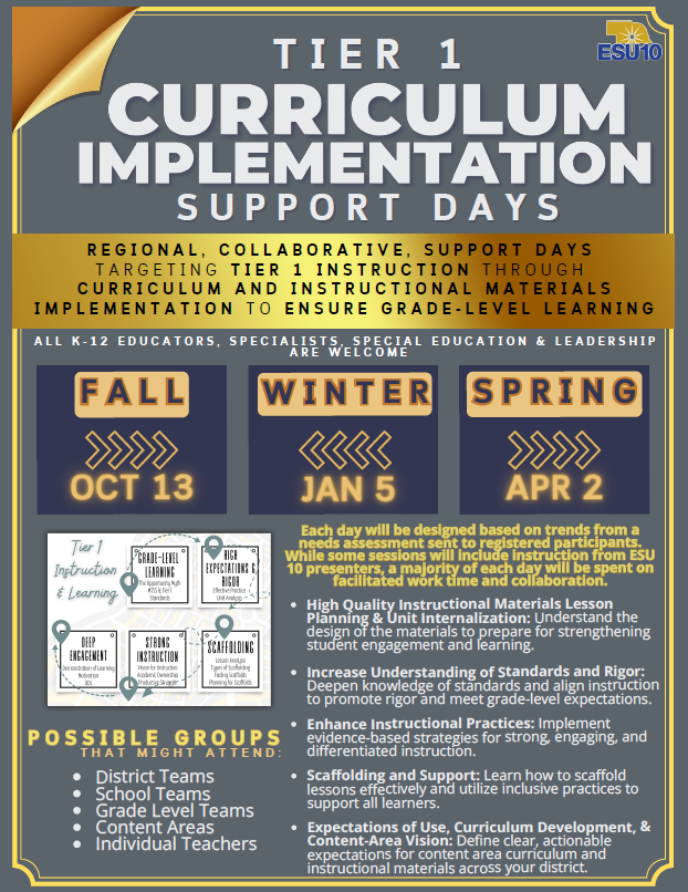 Each day will be designed based on trends from a needs assessment sent to registered participants. While some sessions will include instruction from ESU 10 presenters, a majority of each day will be spent on facilitated work time and collaboration. There will be opportunities to collaborate with like instructional materials and similar grade levels.