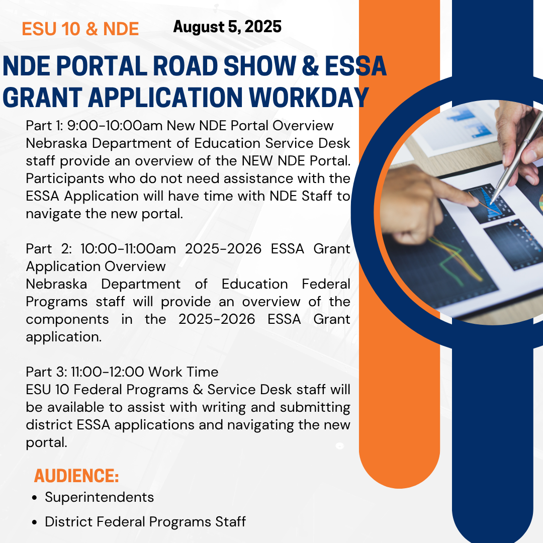 ESU 10 Federal Programs & Service Desk staff will be available to assist with writing and submitting district ESSA applications and navigating the new portal.