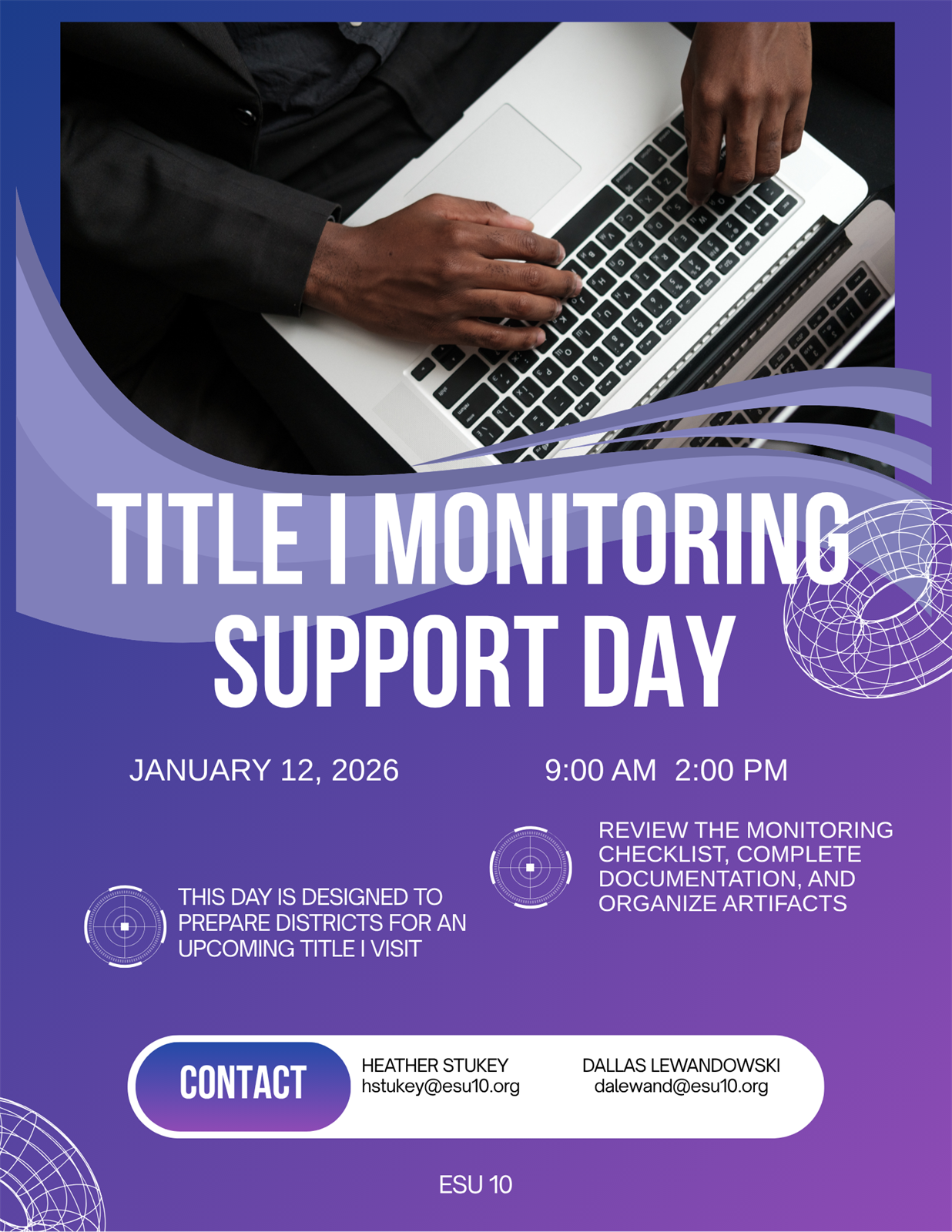 | Description | | This day is designed to support those districts who will have a Title 1 monitoring visit during the 2025-26 school year. Time will be spent discussing the upcoming monitoring visit, completing documentation, and organizing artifacts. |