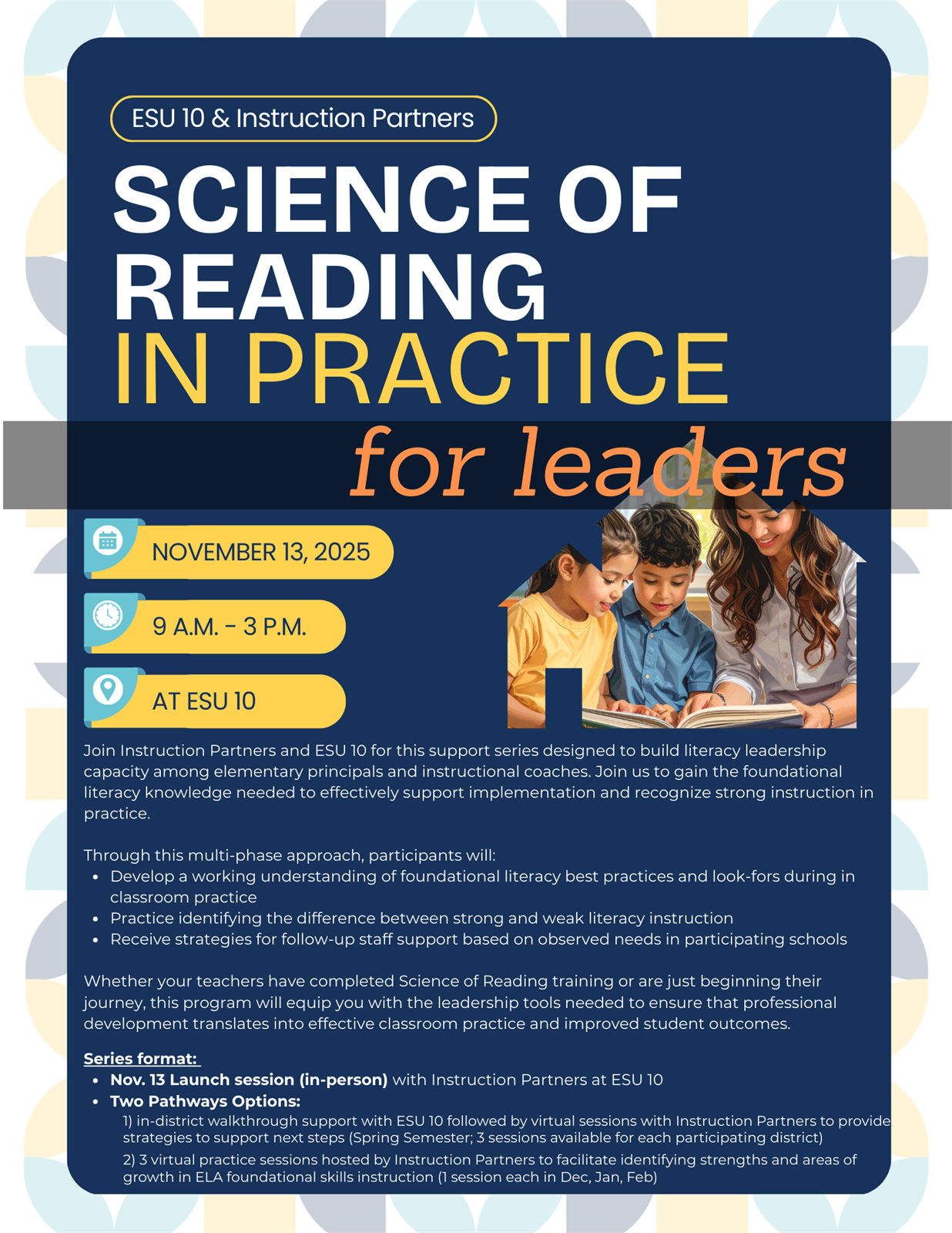 | Description | | Join Instruction Partners and ESU 10 for this support series designed to build literacy leadership capacity among elementary principals and instructional coaches. Join us to gain the foundational literacy knowledge needed to effectively support implementation and recognize strong instruction in practice.
