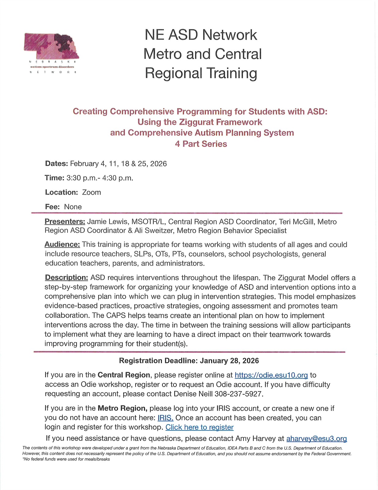 If you are in the Metro Region, please log into your IRIS account, or create a new one if you do not have an account. Once an account has been created, you can login and register for this workshop. If you need assistance or have questions, please contact Amy Harvey at aharvey@esu3.org
