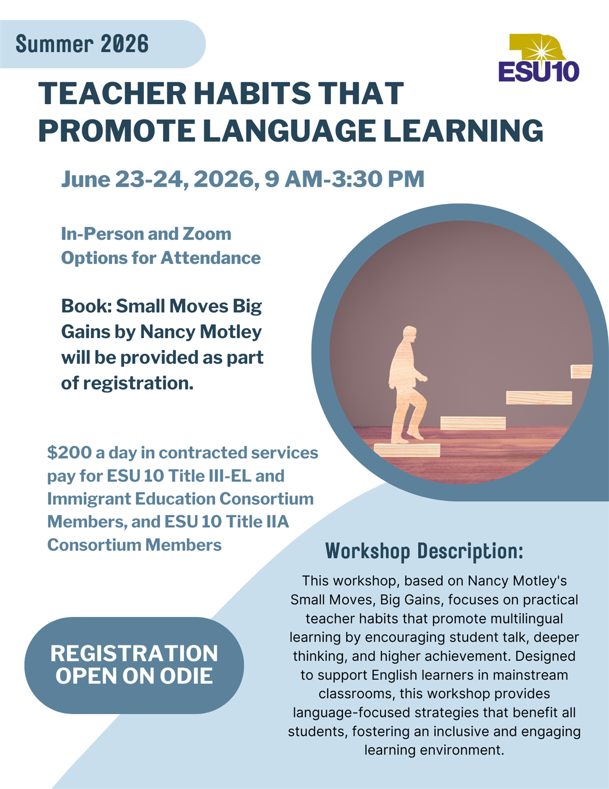 | Description | | This workshop, based on Nancy Motley's Small Moves, Big Gains, focuses on practical teacher habits that promote multilingual learning by encouraging student talk, deeper thinking, and higher achievement. Designed to support English learners in mainstream classrooms, this workshop provides language-focused strategies that benefit all students, fostering an inclusive and engaging learning environment. |