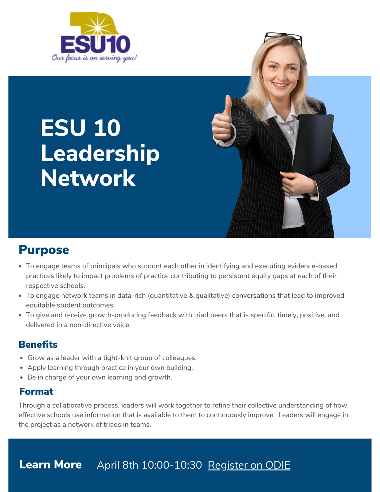 ESU 10 Staff will overview the components of the ESU 10 Leadership Network beginning in August 2025. The network is a professional development series for leaders in ESU 10.