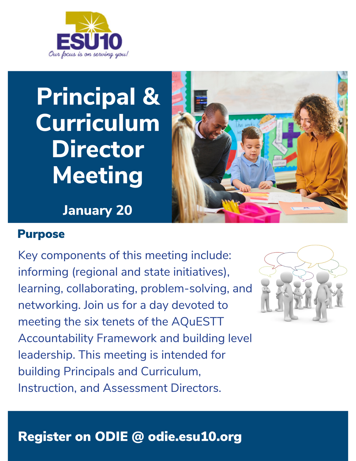 This meeting is held for all school administrators in the ESU 10 region. Lunch is provided. Registration is required. Agenda will be sent via list serve.
