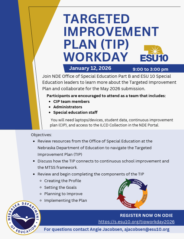 Join NDE Office of Special Education Part B and ESU 10 Special Education leaders to learn more about the Targeted Improvement Plan and collaborate for the May 2025 submission.